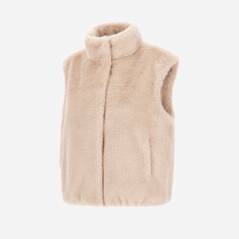 ソフトで包み込むようなフェイクファー生地を使用したベスト。滑らかなミンクのような質感です。このアイテムは、端境期に重ね着するのに最適で、スタンドカラーと比翼仕立ての開閉が、さりげないラグジュアリー感を演出します。