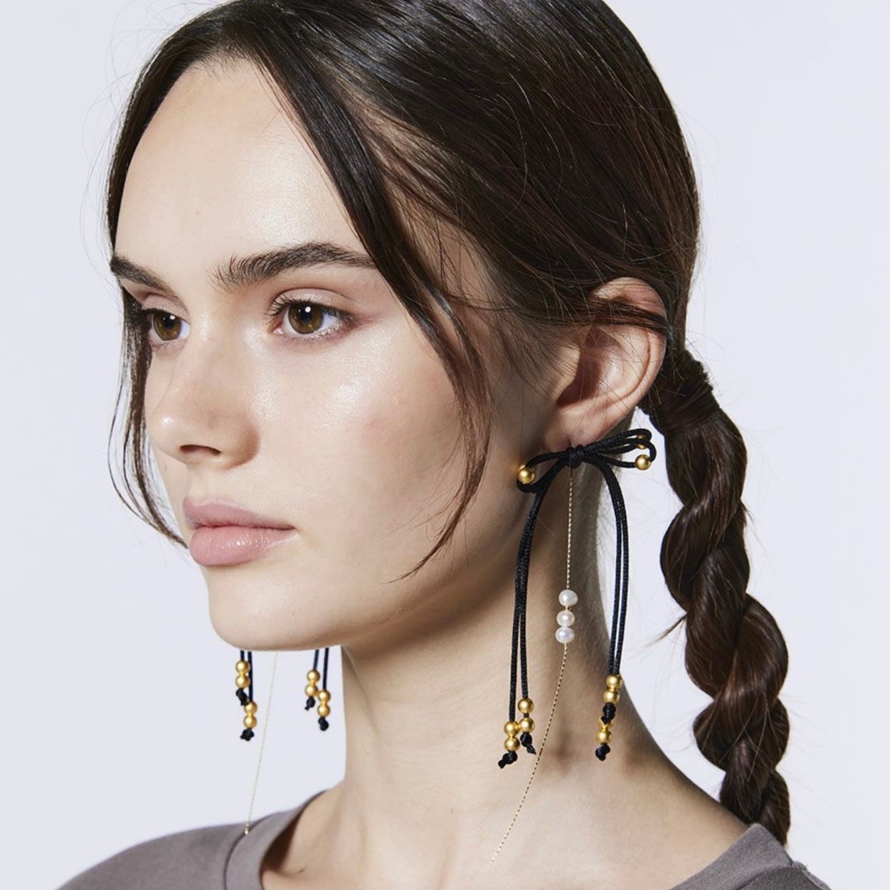 ブラックリボンとパールを組み合わせた、異素材のコントラストが印象的なピアス。動くたびに上品に揺れ、エレガントな雰囲気を演出します。ショートヘアやまとめ髪のアクセントとしても活躍し、ヘアアクセサリー感覚で取り入れられるのも魅力。カジュアルからオケージョンシーンまで幅広く使えるアイテムです。